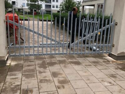 Motordriven grind för BRF, i kombination med vanlig grind med handtag för gångpassage.